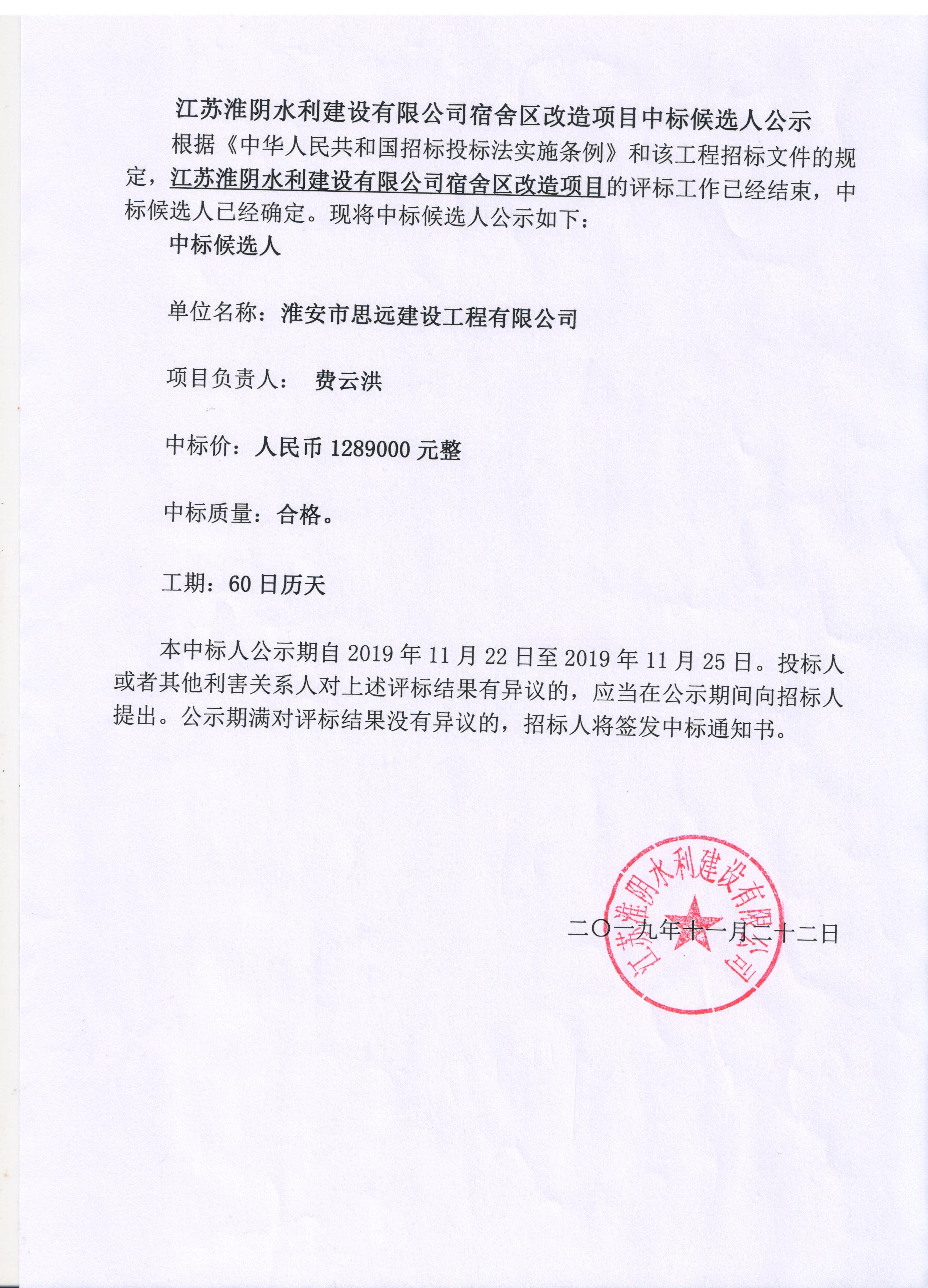 江蘇淮陰水利建設有限公司宿舍區改造項目中標候選人公示